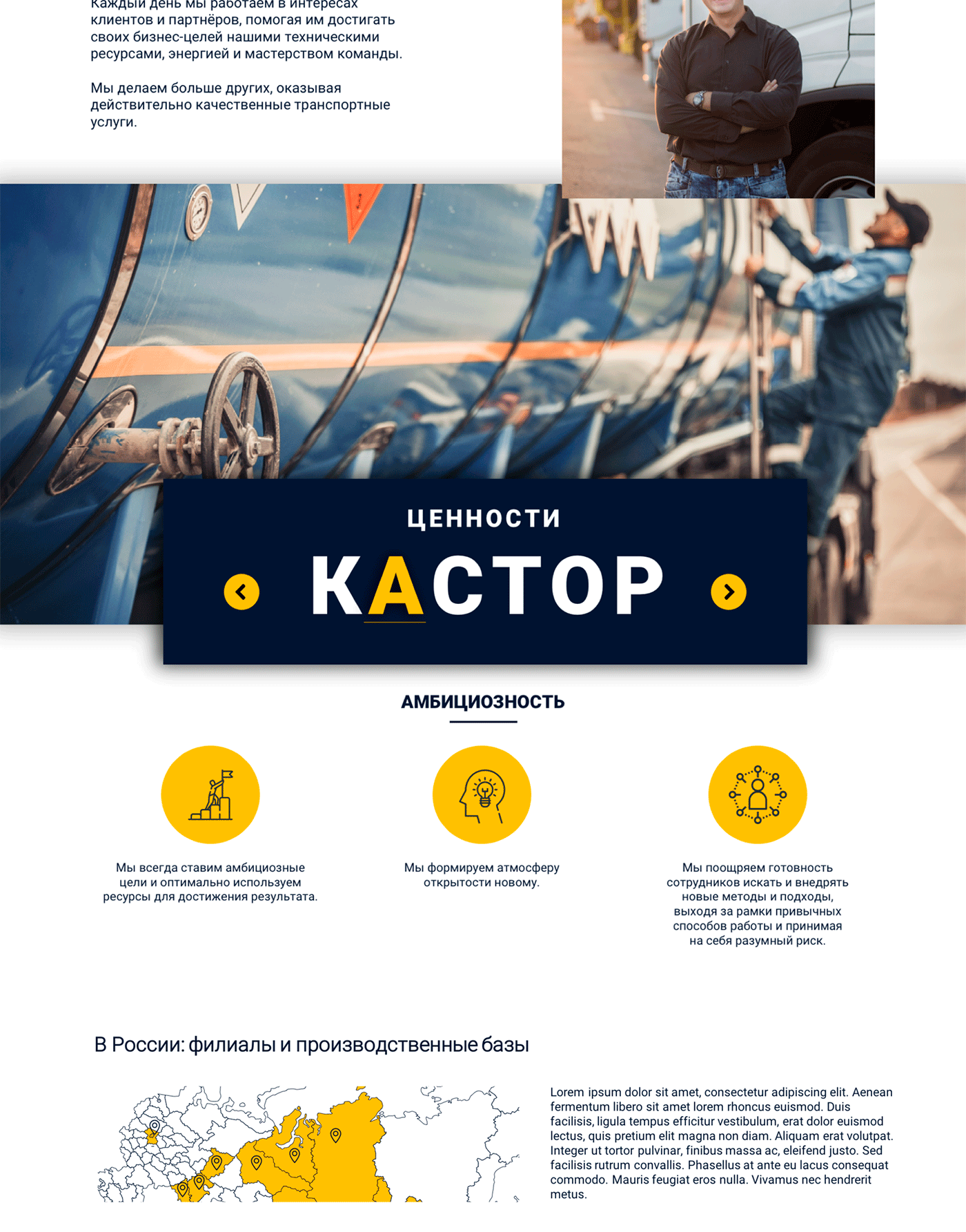 Новые клиенты при первом посещении сайта транспортной компании часто смотрят раздел "о компании". Поэтому важно рассказать о себе самое важное: историю на рынке, миссию и ценности.