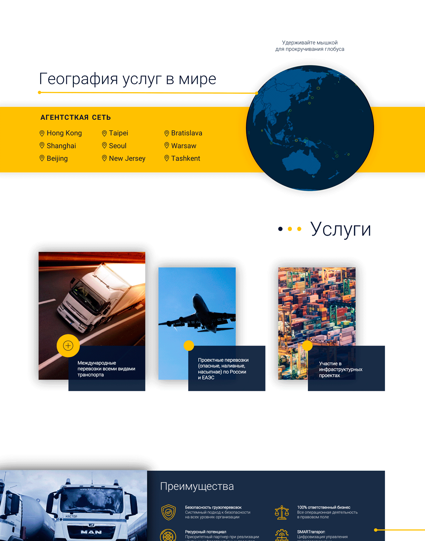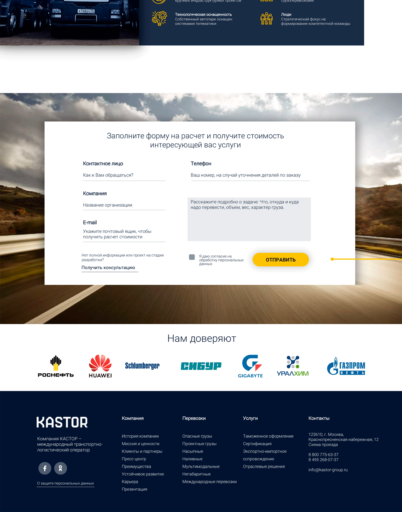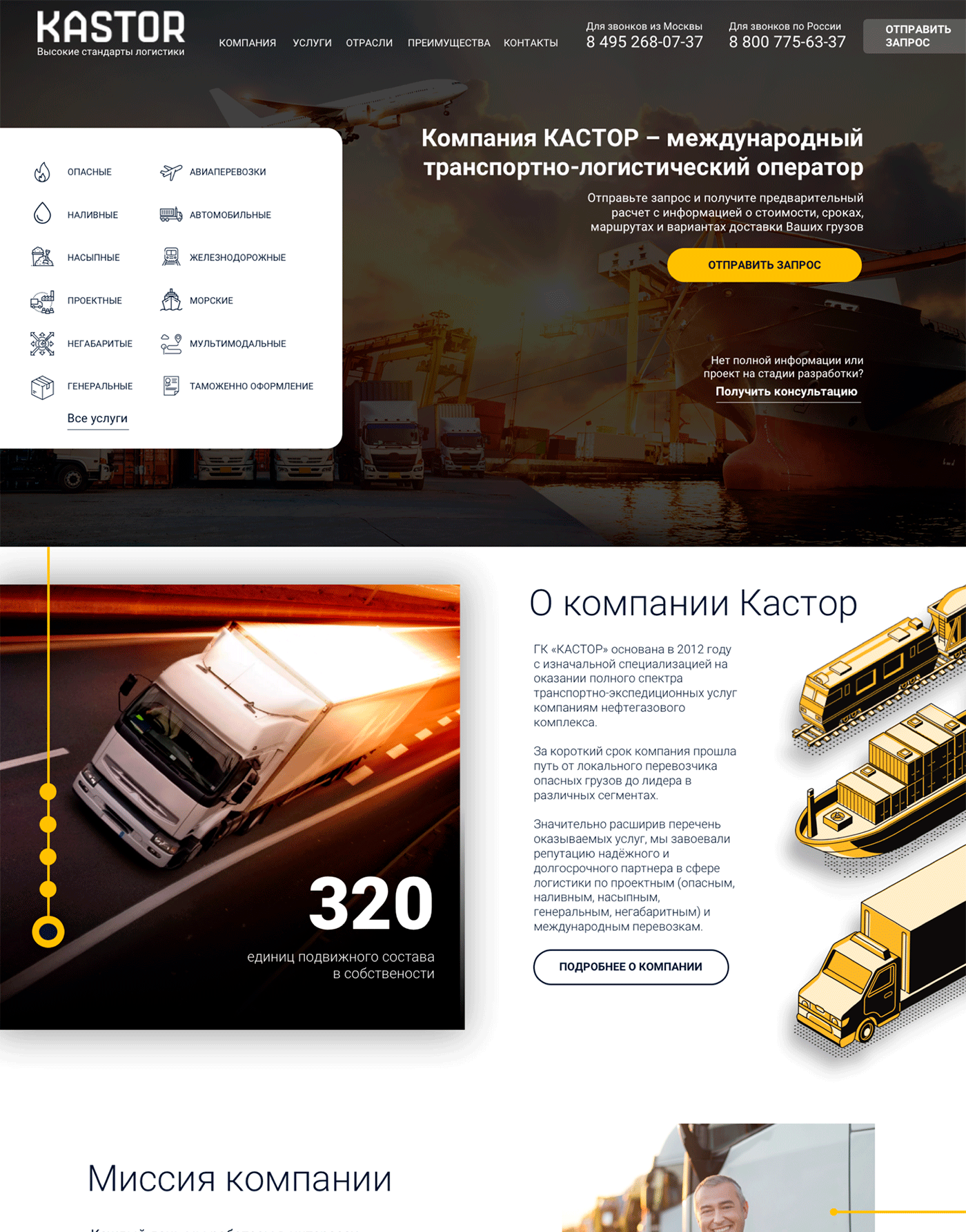 Для главной страницы сайта транспортной компании мы использовали тёмный фон: он достаточно контрастный в сочетании со светлым шрифтом.